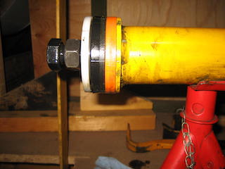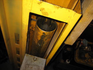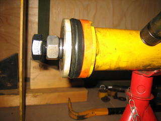 The next thing to do is to drain the hydraulic oil out of the cylinder, or at least drop the level of it, as you will not be able to push the piston down against the oil. I cannot quite remember how I did this, but I think I removed the oil reservoir and may be just operated the down lever. Either way, I removed some oil somehow. The piston needs to be persuaded to lower into the cylinder until its lower enough to reconnect to the ramp stirrups. After that the weight of the ramp will do the job.