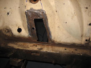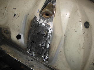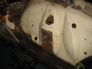 Rollover image for larger picture Once stripped, I counted up about a dozen areas needing welding, ranging from major things such as the floors, to much smaller repairs. I thought I'd start at the front, so tackled the corrosion between the shock absorber mounting strengthener piece and the inner wing. |