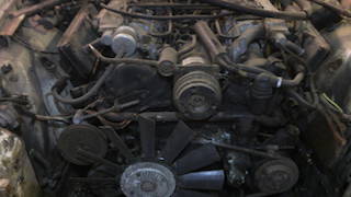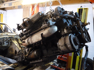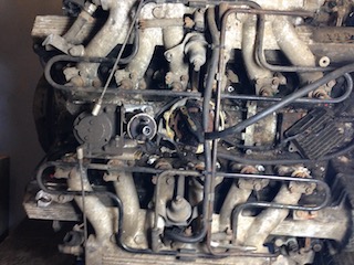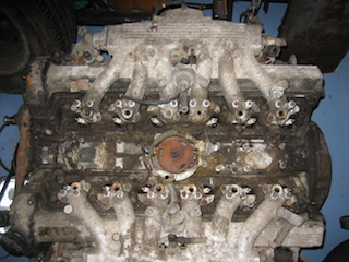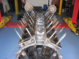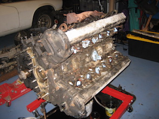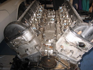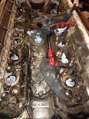Other than a high degree of carbon, the engine looks largely OK. I think I got lucky as only one or two studs each side were dragging and you may be able to see white residue on some of the studs. The ones at the ends that do not run in the water jacket look like new. I think I am lucky in that the Jaguar service schedule involving Bars Leak was probably not followed too enthusiastically. Once the seal was broken, I could feel the heads rocking on the one or two studs that caused the sticking and a bit of persuasion with a hammer did the rest.